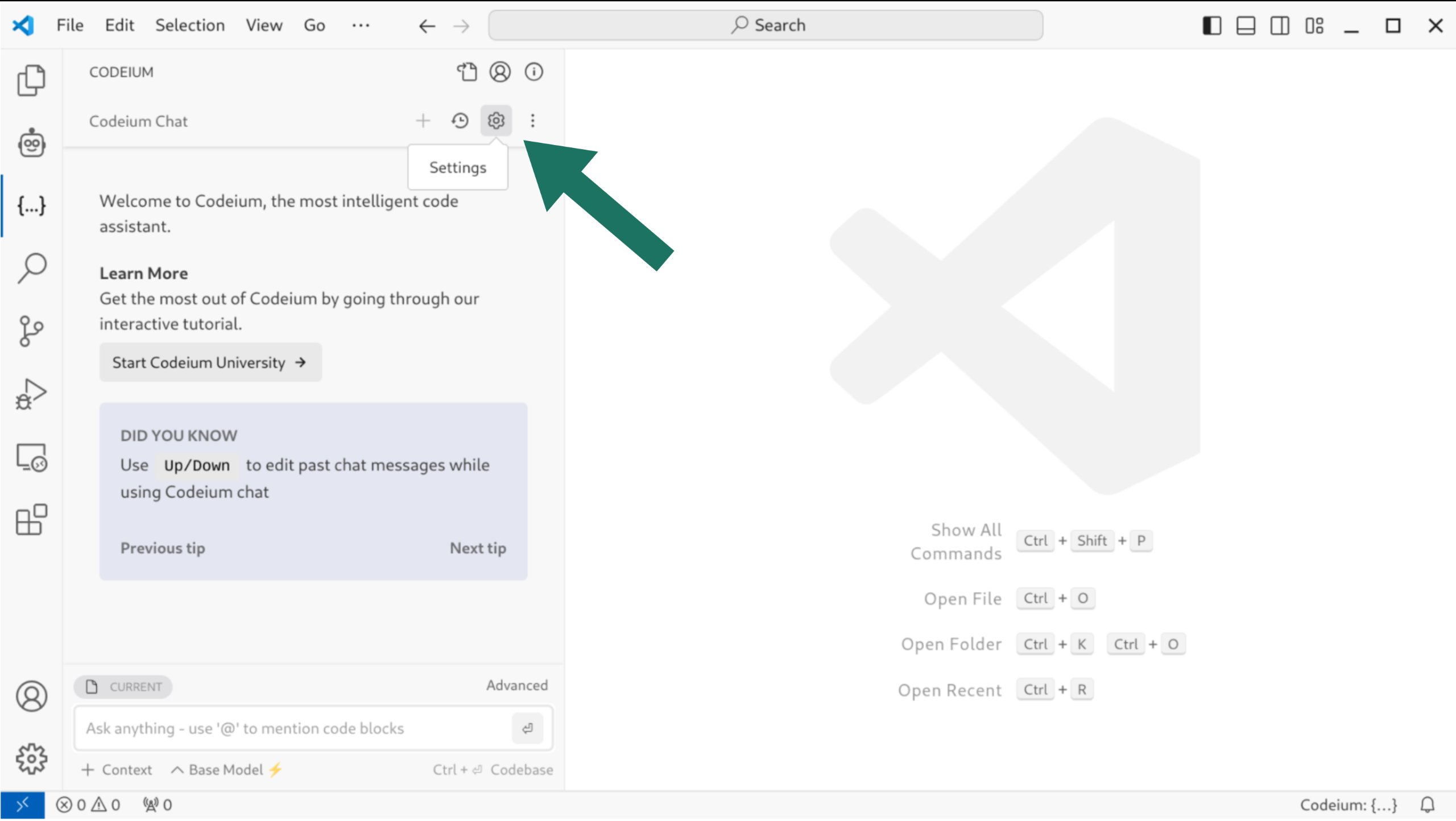 - Select the Settings button (gear icon) in the top-right corner of the Codeium pane
